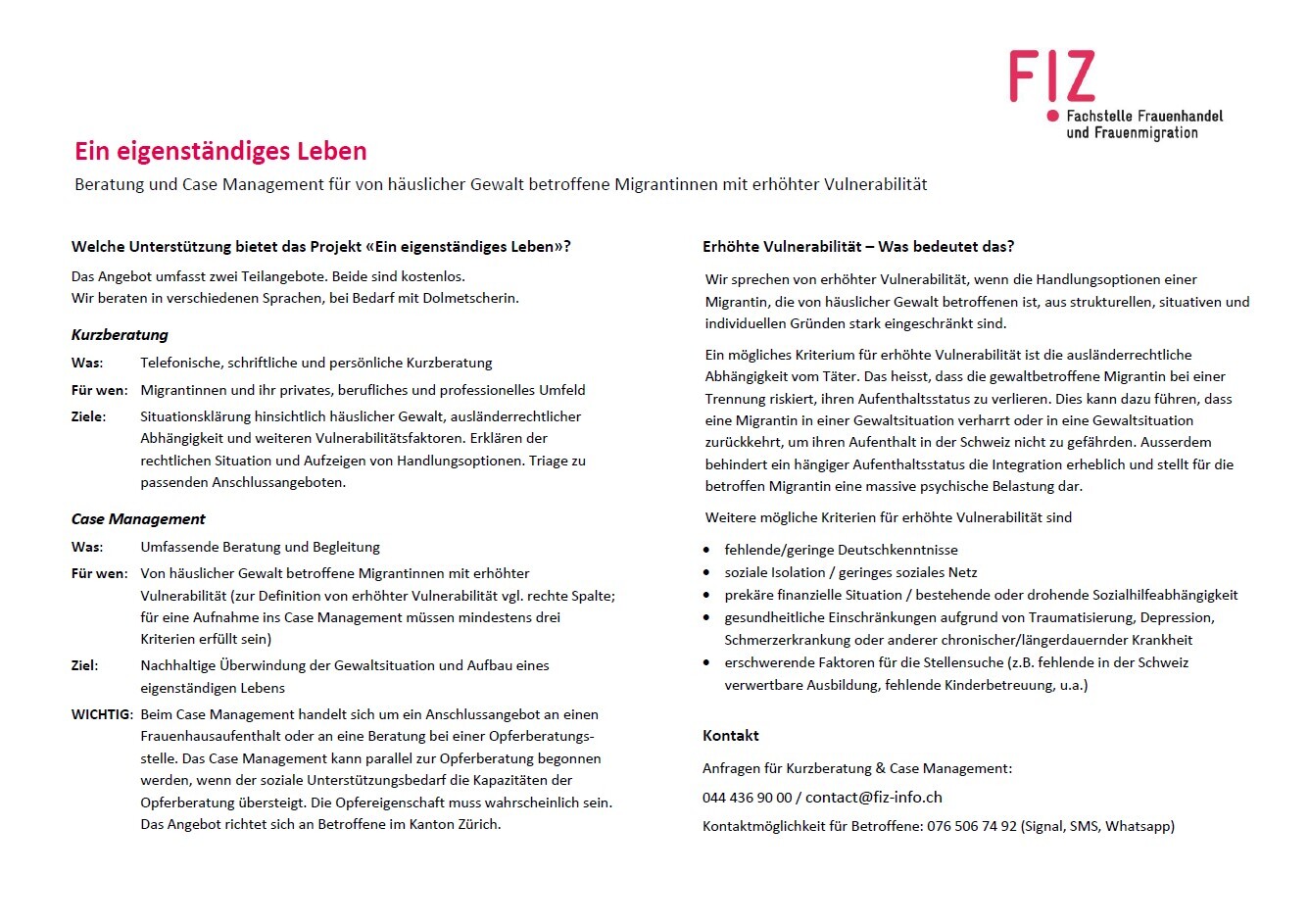 Anfragen für Kurzberatung & Case Management: 044 436 90 00 / contact@fiz-info.ch